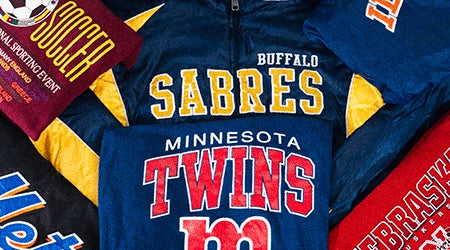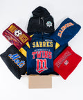 Rep your team with authentic gear. NHL, NBA, NFL, MLB, NCAA pieces from the 80s-00s. Each box contains sought-after items: faded logo tees, starter jackets, team crewnecks. Tell us your favorite teams (Habs, Raptors, Lakers, Yankees, etc.) and we'll pack accordingly. Real throwback gear with that perfect worn-in look.